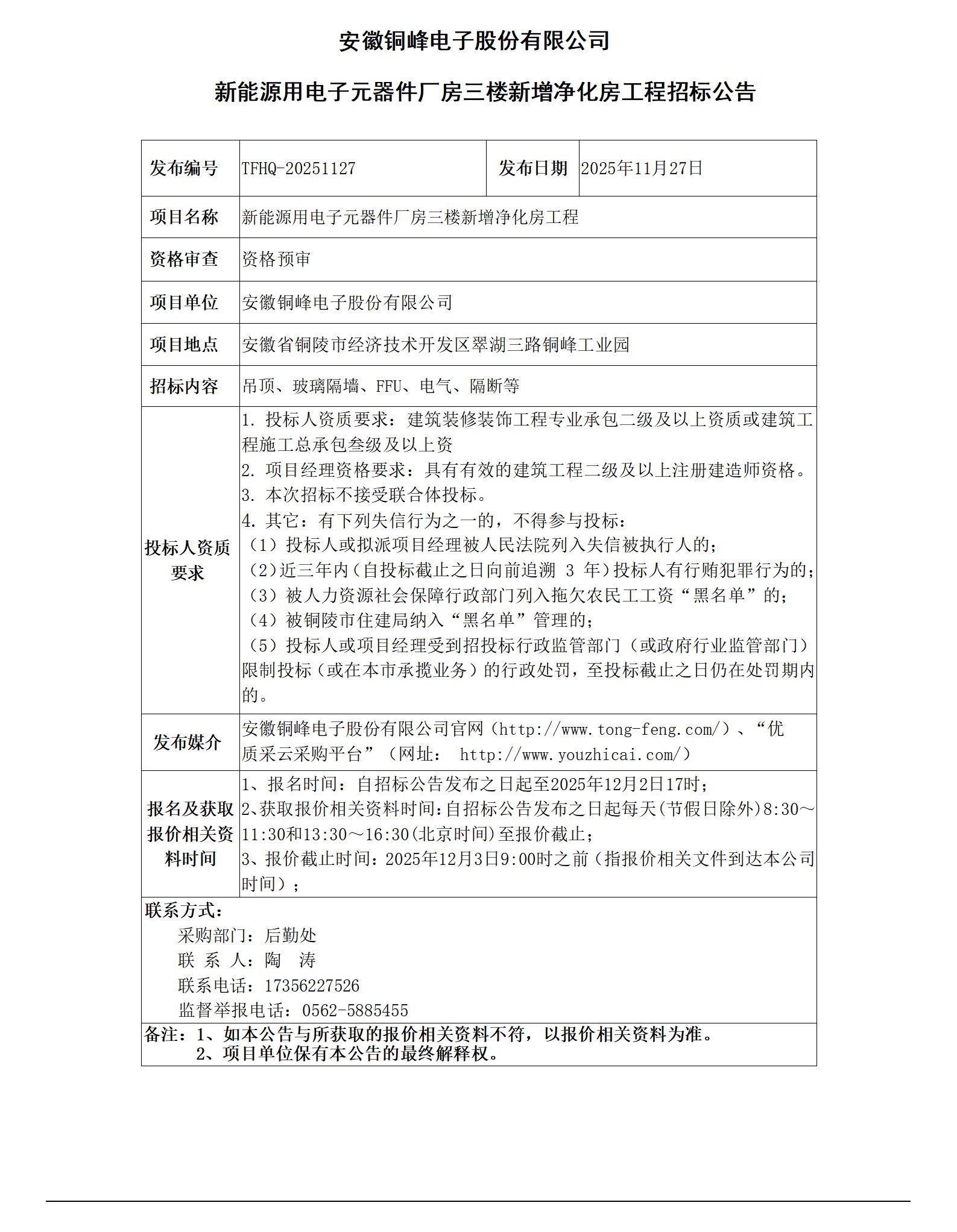 01安徽銅峰電子股份有限公司 (新能源用電子元器件廠房三樓新增凈化房工程 招標公告)_01