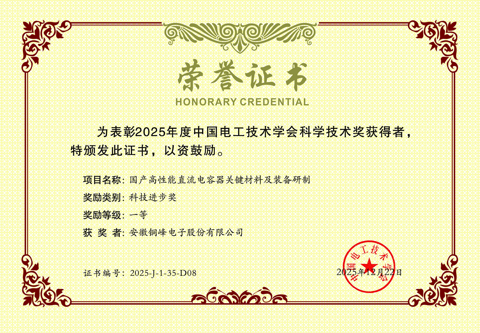近日,公司參與的合作項(xiàng)目“國產(chǎn)高性能直流電容器關(guān)鍵材料及裝備研制”榮獲2025年度中國電工技術(shù)學(xué)會科技進(jìn)步一等獎。